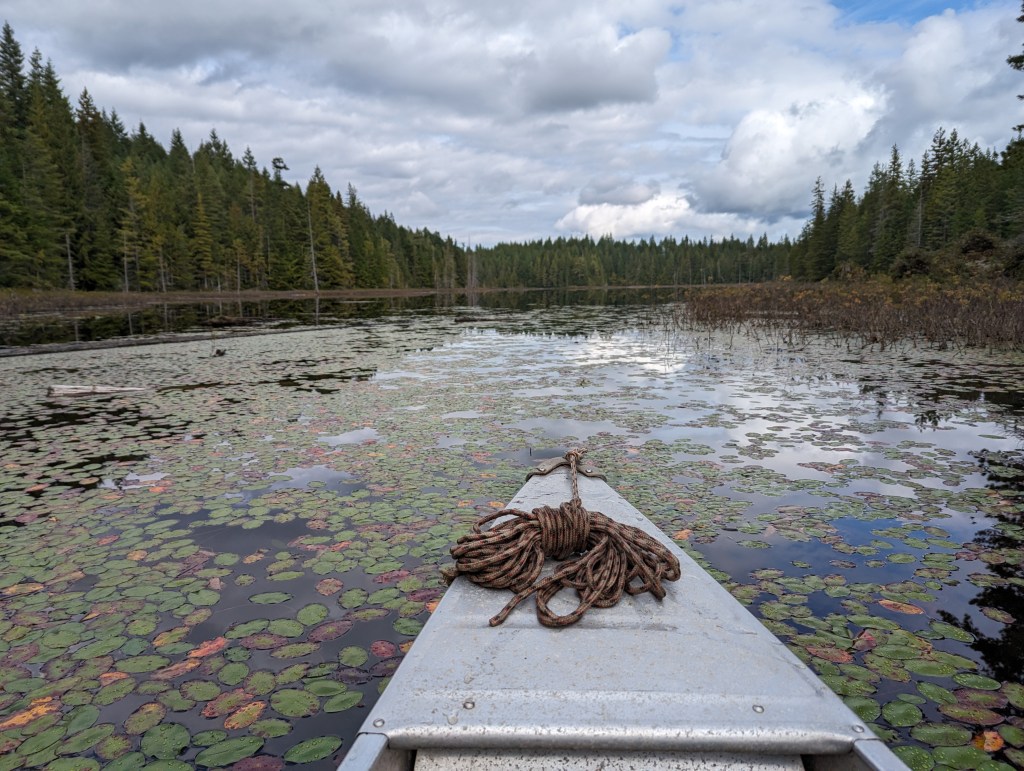 This being a remote part of Vancouver Island, we didn’t encounter many people. On our second day, during one of the longer portages, we met two burly men in their twenties, both holding a can of beer and in good spirits. We chatted a little, then continued carrying our bags. At the next lake, we saw their boat and some of their gear. On the way back to get our canoe we encountered them again. They were carrying our Grumman monster for us. It was heavy enough for the two of us, and even then it was hard going, but now one of them was carrying it by himself, uphill, over rocks.