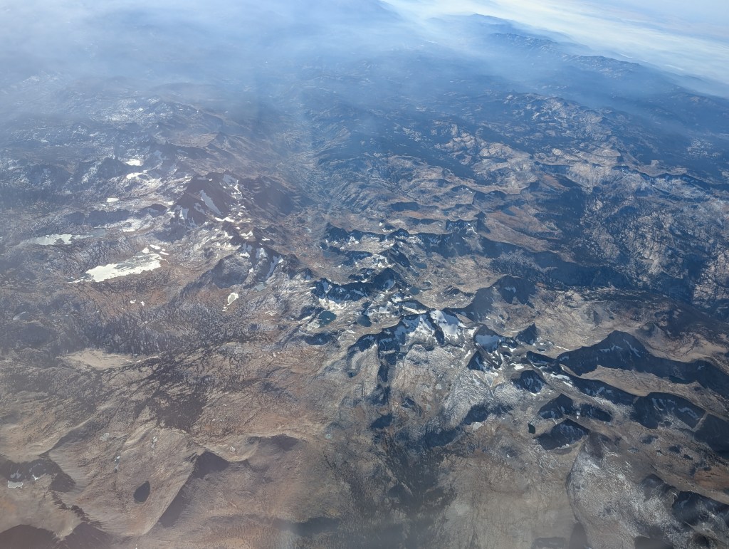 Later yet, we’re above the Eastern slope of the Sierra Nevada. If I were down there, I’d drive along Highway 395 until I find a side road that leads closer to the peaks. It’d have to promise a creek or a clearing among the pine trees that I could camp in. One small lake that I see from my plane’s window is frozen and has a smattering of ice on it. Maybe I could find that one, and after making sure the ice is solid enough, venture out on it. I’d run as fast as the ice allows, then stop and slide towards the snowy shore until it’s time to make a fire and warm some soup.