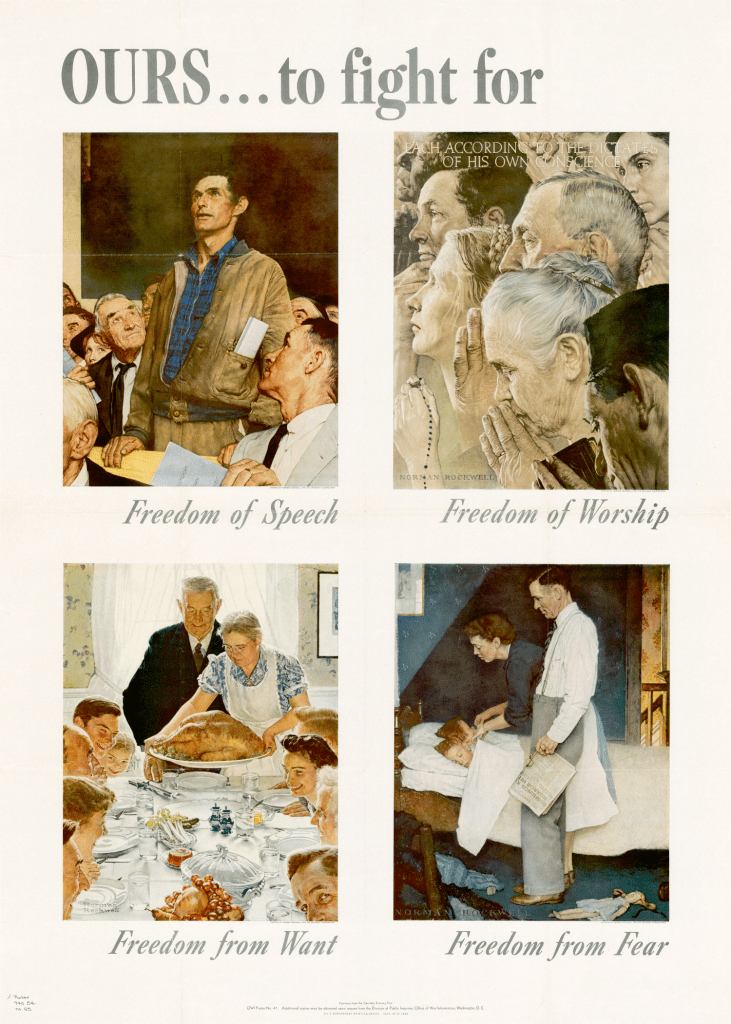 - Freedom to realize goals. Examples are freedom from want (the right to jobs, economic security and an education etc.) rand the right to vote. Those are positive liberties.